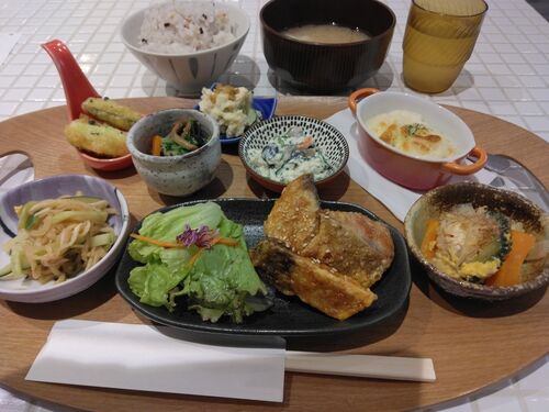 本日は一汁八菜ランチ メインはブリのヤンニョムダレ 切り干し大根と胡瓜の中華和え 胡瓜の天ぷら 水菜となめこの煮物 ポテトサラダ 菊菜としめじの白和え グラタン ゴーヤチャンプル お味噌汁です ご飯も雑穀米なのが嬉しいです 赤いスプーン型の器に入った…