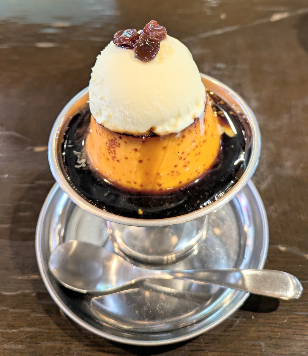 2025-05-27 本日のモーニングです☕ ホットハムサンドにしました🥪 美味しそうな王様のカスタードプリンが目に入り、注文してしまいました🍮 苦味の効いたカラメルに、卵黄たっぷりの硬めのプリン、その上にアイスクリームとレーズンがのっていました🍮 美味しくて大満足でした😋 ご馳走様でした🙏