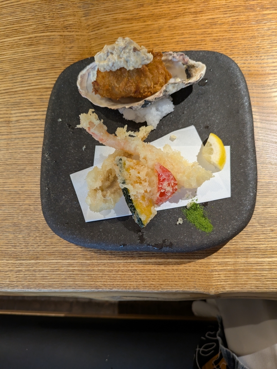 2025-08-25 女子会でした😁 モーニングは、コーヒーだけにしました☕ ランチは個室の女子会です😊 雰囲気が良い感じです✨ まずは、お豆腐です😊 天ぷらと牡蠣フライです🍤🐟️🫑🎃🦪 牡蠣フライには、いぶりがっこのタルタルソースです😋 牛肉のひつまぶしです🐮 最後は、お出汁をかけて頂きました😋 予約クーポンで、コーヒーとわらび餅がついて来ました☕ 個室でゆっくり出来て、お腹もいっぱいになりました(^o^)v 今日も、楽しい1日でした❇️